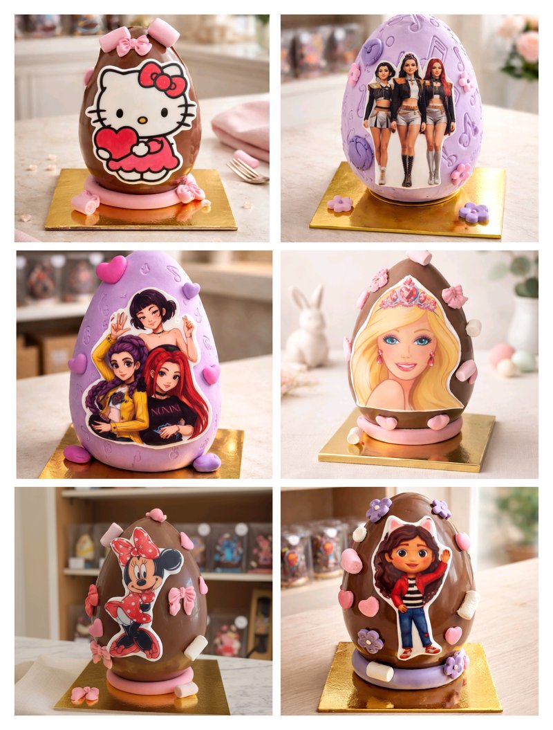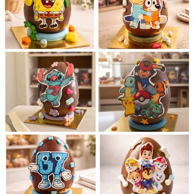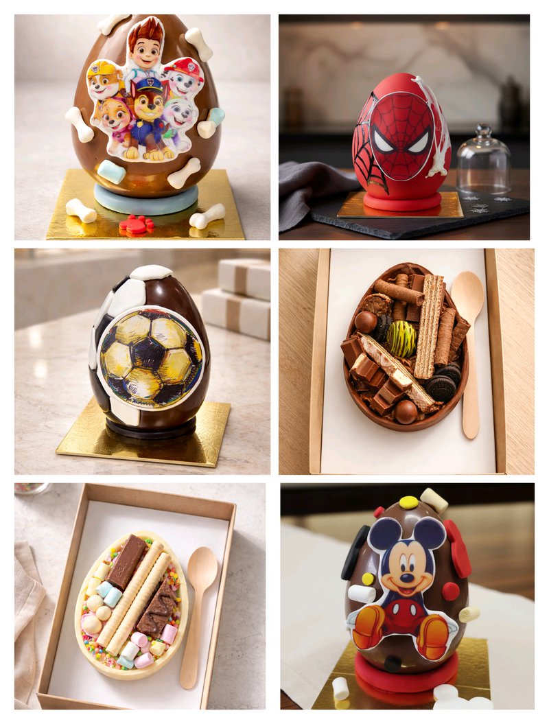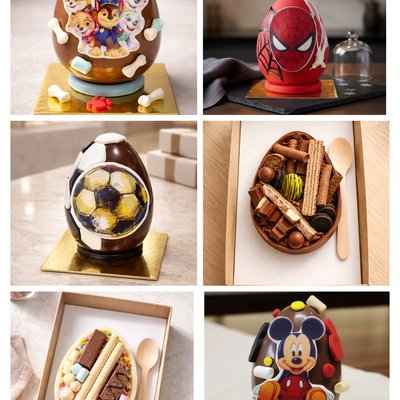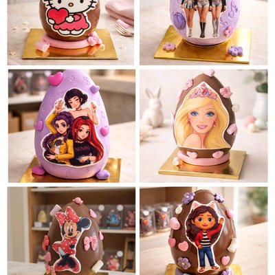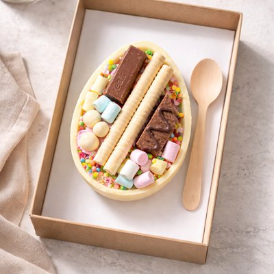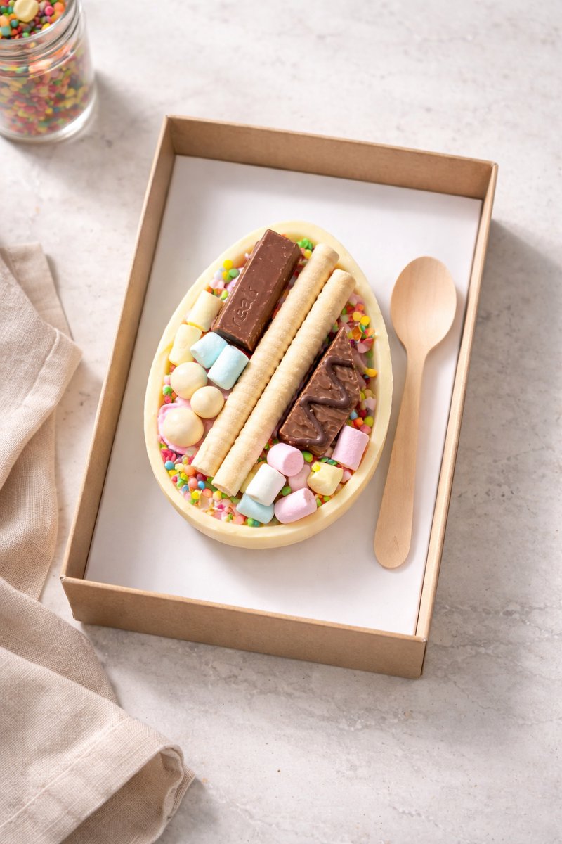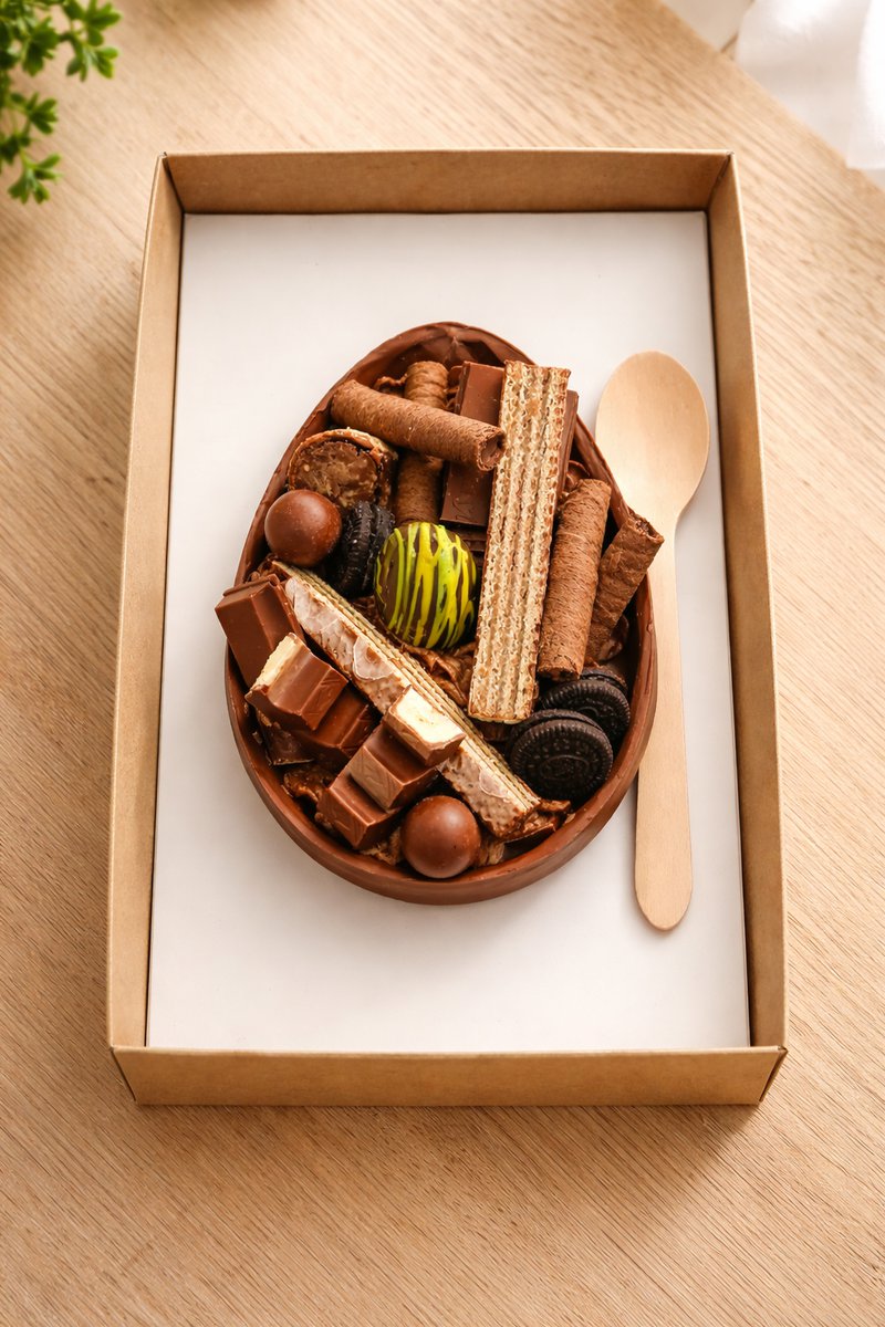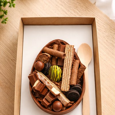 Half milk chocolate egg With chocolate fudge cake, hazelnut cream, hazelnut praline and oreo cookies & chocolates